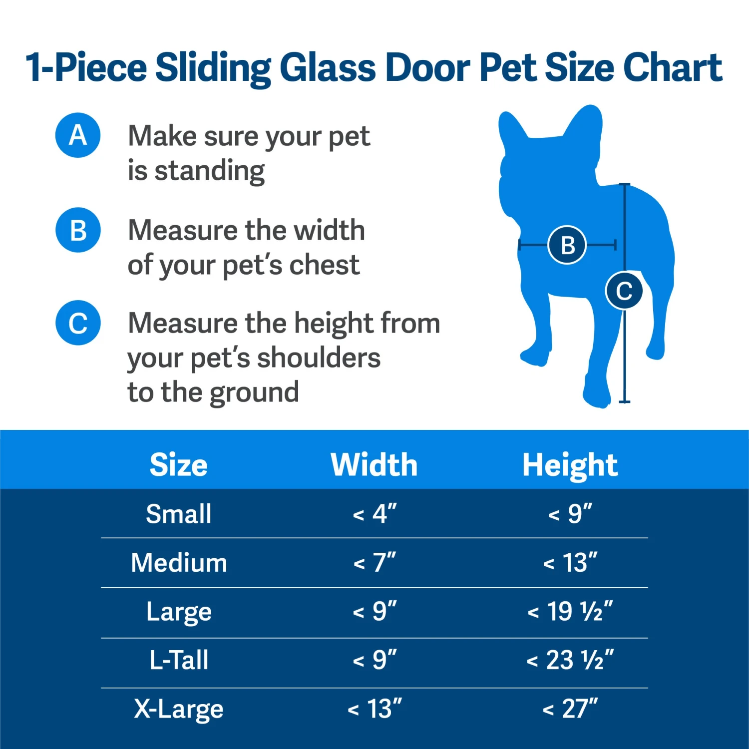 To choose the right size pet door for you, first measure your door frame to determine which pet door is the right size for you; the Sliding Glass Pet Door, 1 Piece – 81 inch or Sliding Glass Pet Door, 1 Piece – 96 inch. Next, choose what size flap opening is the right size for your dog or cat.