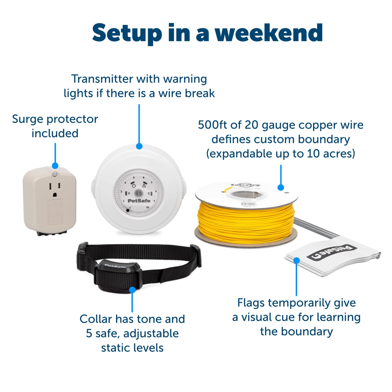Dogs love to play so we’ve designed a fence that gives them more space to run! With standard in-ground fences, your dog gets a correction before he steps over the buried wire. But with our YardMax® In-Ground Fence™, your dog won’t get a correction until after he steps over the buried wire, giving him the feeling that the correction area is infinite! With this fence you’ll get 500 ft of wire so you can fence in a 1/3-acre yard. If your yard is bigger, just purchase more wire to fence in up to 10 acres for your pet. You’ll also get 1 YardMax® Rechargeable In-Ground Fence™ Receiver Collar which has a tone-only mode and 5 levels of safe, static correction that you can adjust based on how your dog responds during training. With a little training, your dog will learn his new play area in just 2 weeks! If he ever tries to run through the boundary, the infinite correction area outside the boundary will help encourage your pet to turn and head back home. If you have more than 1 pet at home, purchase additional receiver collars so all of your pets can safely play in the yard together. Your pet deserves the best. Trust PetSafe® to keep your pet healthy, safe and happy.